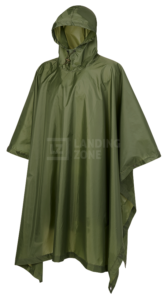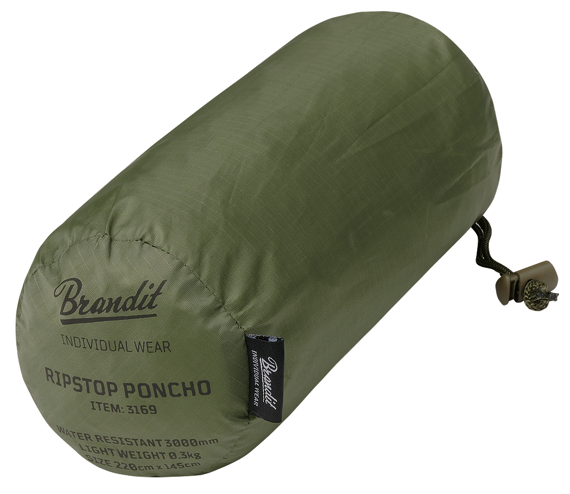 Dežni pončo proizvajalca Brandit. Potisni gumbi omogočajo, povezovanje dveh pončov skupaj ( uporabno kot ponjava ali za oblikovanje rokavov).