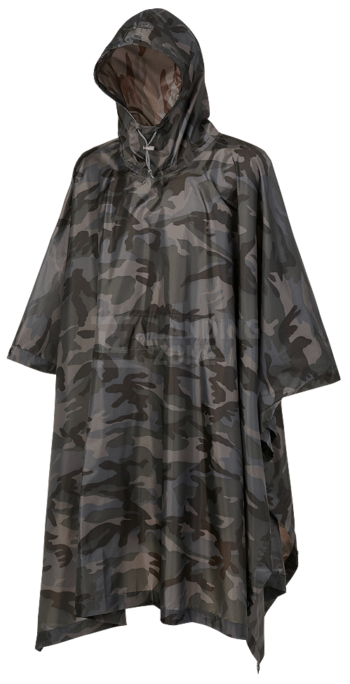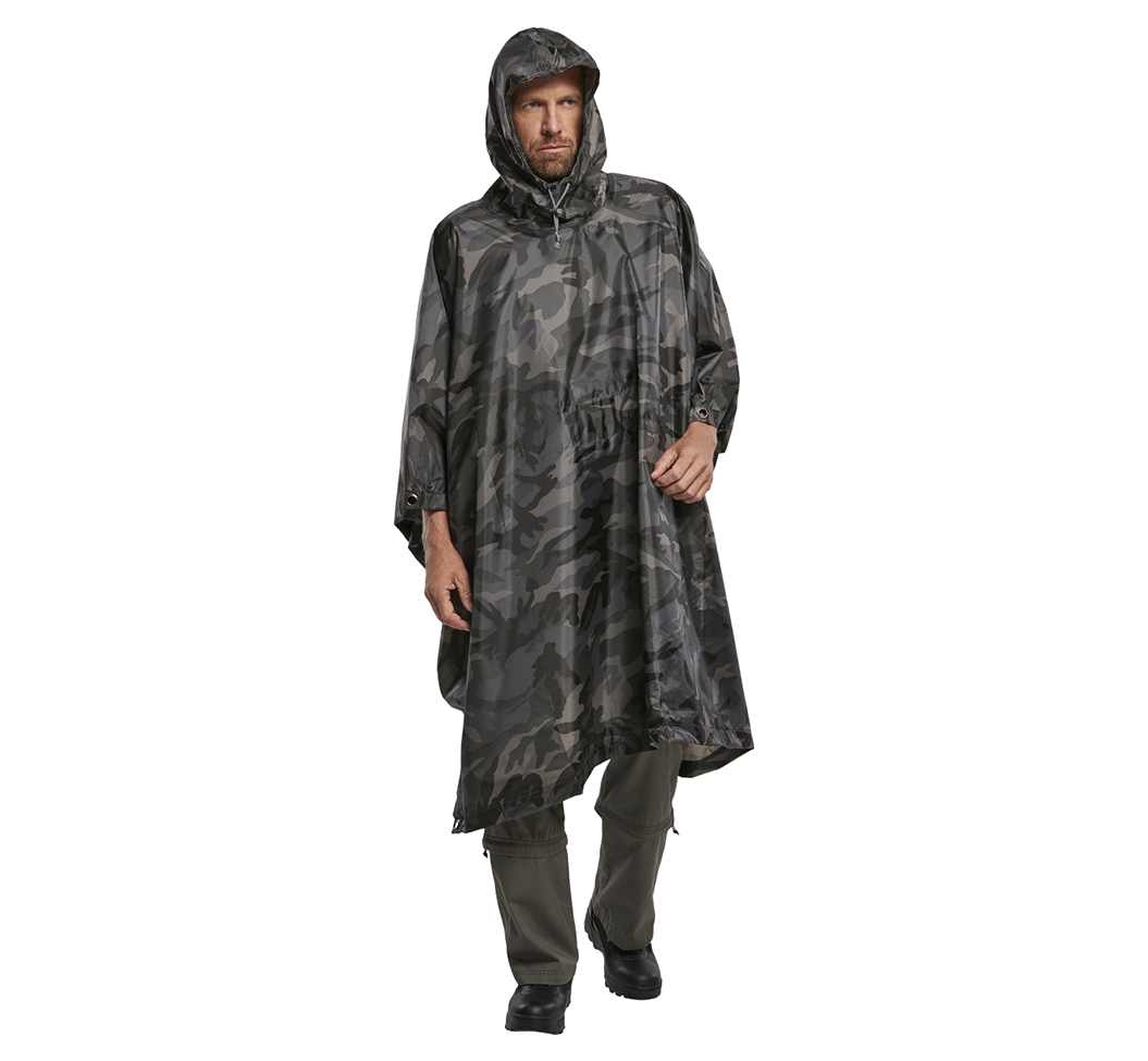Dežni pončo proizvajalca Brandit. Potisni gumbi omogočajo, povezovanje dveh pončov skupaj ( uporabno kot ponjava ali za oblikovanje rokavov).