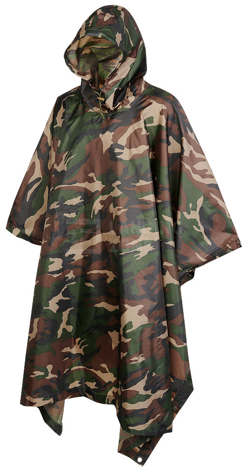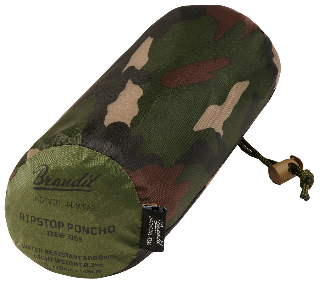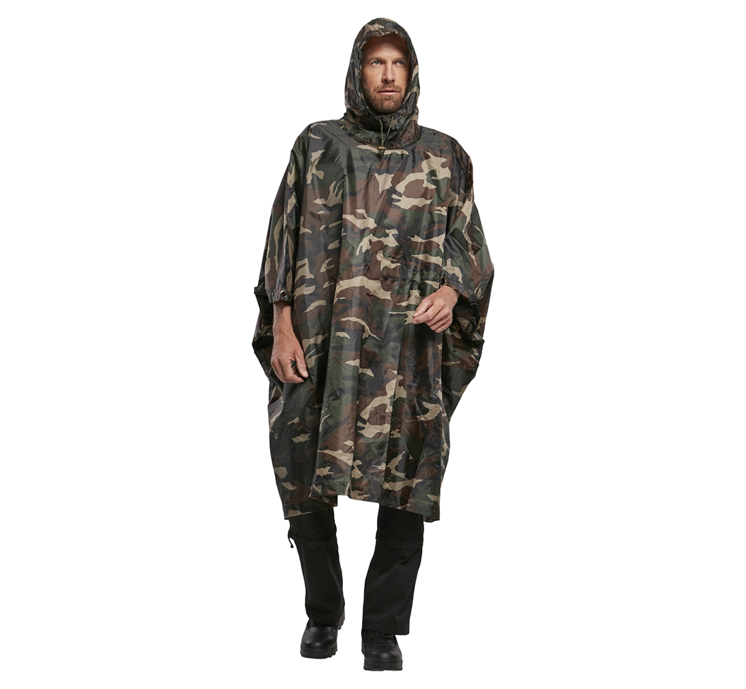 Dežni pončo proizvajalca Brandit. Potisni gumbi omogočajo, povezovanje dveh pončov skupaj ( uporabno kot ponjava ali za oblikovanje rokavov).