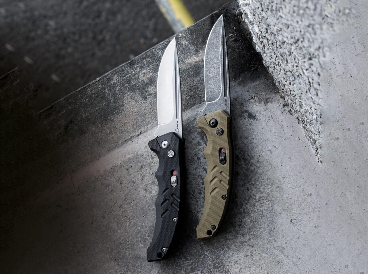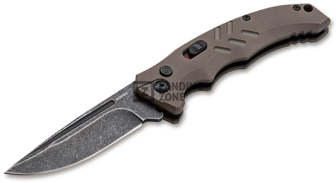 Böker Plus Intention, zasnovan kot taktični avtomatski nož, ki prepriča ne le na terenu, ampak se brez težav spopade tudi z vsemi rezalnimi nalogami, ki se pojavijo v vsakdanjem življenju. Pritisk na gumb sprosti rezilo s stonewash zaključkom, ki je izdelano iz D2 jekla. S pomočjo napetosti vzmeti za njim, se nož avtomatsko odpre. Drsni zaklep dodatno zavaruje nož pred nenamernim sproščanjem. Ergonomsko oblikovan ročaj je izdelan iz teksturiranega G10. Narebren del na območju za položaj palca in izrazita odprtina za prste dodatno izboljšujejta ročni položaj in rokovanje. Ima odprtino za vrvico in nameščeno žepno zaponko.