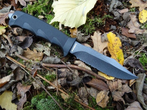 Ergonomsko oblikovan ročaj iz teksturiranega polimera zagotavlja varen oprijem, tudi v mokrih pogojih ali pri uporabi rokavic. Vgrajena konica za razbijanje stekla na koncu ročaja povečuje funkcionalnost v nujnih situacijah. Nož je opremljen z vzdržljivo najlonsko nožnico, ki jo je mogoče varno pritrditi na pas.