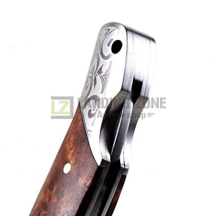 Majhen preklopni nož iz Damaščanskega večplastnega jekla. Lesen ročaj v kombinaciji s kovino ki je ornamentirana, dajeta nožu eleganten pridih.