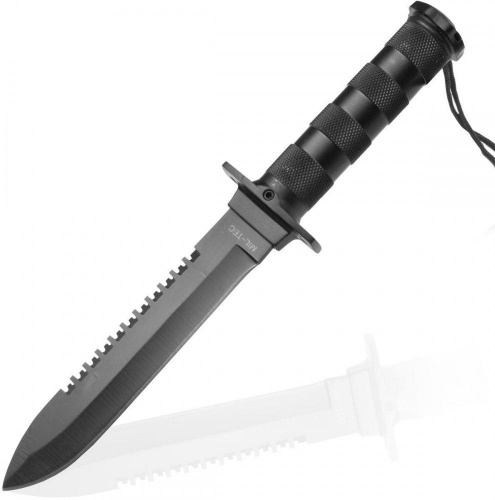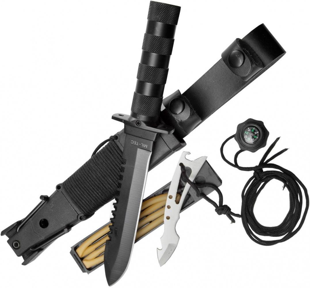 Preživetveni nož s spravilnim etuijem. V ročaju noža je skompresirano sestavljeni preživetveni komplet. Na zadnji strani ročaja je spravljeno preživetveno orodje, na notranji strani navojnega čepa ročaja pa je nameščen tudi kompas.