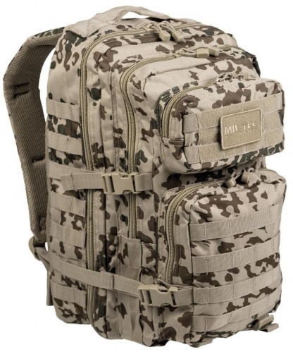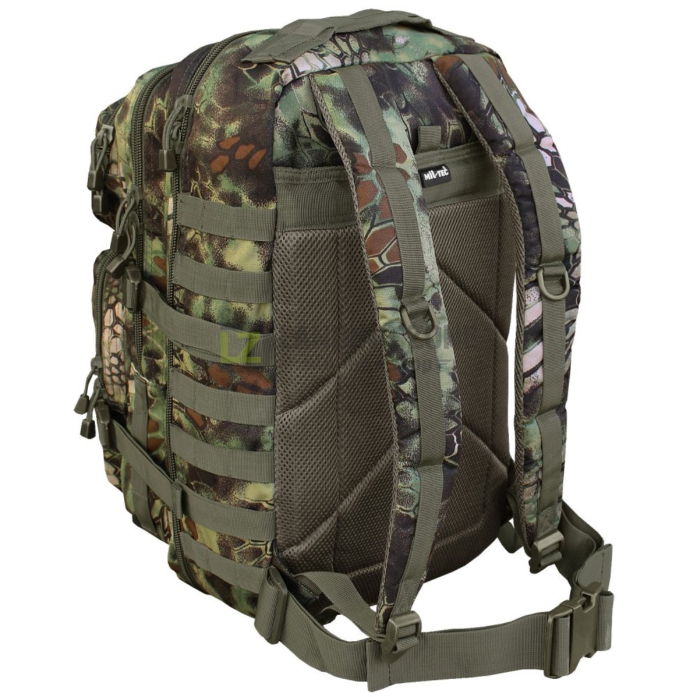 Praktičen, večji modularni nahrbtnik Assault II. proizvajalca Miltec. Odličen vsakdanji sopotnik za aktivno uporabo na izletih, potovanjih, kot šolski nahrbtnik,... Dva velika prekata nahrbtnika sta v notranjosti opremljena z mrežnimi žepi, ki omogočajo enostavno in učinkovito organizacijo opreme. Dva dodatna vrhnja žepa sta namenjena spravilu opreme do katere potrebujemo hitrejši dostop (telefon, denarnica, ključi,... ). Nahrbtnik Assault je opremljen z molle trakovi, ki omogočajo dodajanje molle kompatibilnih torbic in s tem povečanje volumna po potrebi.