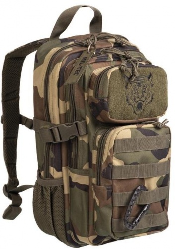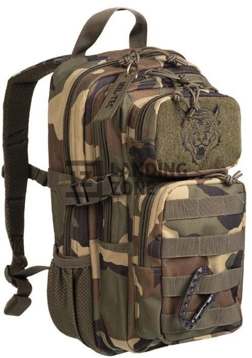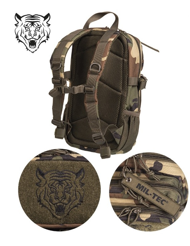 Otroška verzija modularnega nahrbtnika Assault, proizvajalca Miltec. Odličen vsakdanji sopotnik za aktivno uporabo na izletih, potovanjih... Dva velika prekata nahrbtnika sta v notranjosti opremljena z žepi. Na sprednji strani sta dva dodatna žepa ob straneh pa še dva mrežna. Nahrbtnik je opremljen z molle trakovi, ki omogočajo dodajanje molle kompatibilnih torbic in s tem povečanje volumna po potrebi. Oblazinjeno hrbtišče in naramnice obložene z mrežno zasnovo za večji pretok zraka. Naramnice so nastavljive po dolžini. Ob straneh nahrbtnika so kompresijski trakovi. Dvostransko odpiranje in zapiranje nahrbtnika. Na prednji strani se nahaja velcro osnova z vezenim motivom tigra.