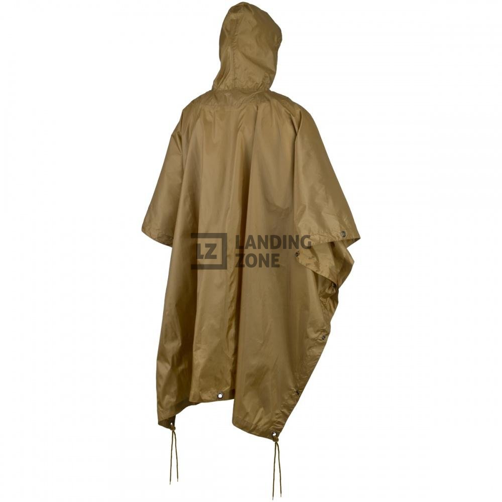 Dežni pončo s kapuco. Izdelan iz RipStop materiala, odpornega na trganje z lepljenimi šivi. Na vsaki strani štiri potisni gumbi za oblikovanje rokavov ali združevanje dveh pončov za izdelavo ponjave. Osem kovinskih rink omogoča uporabo ponča tudi kot šotor. Zložen v transportni vrečki.