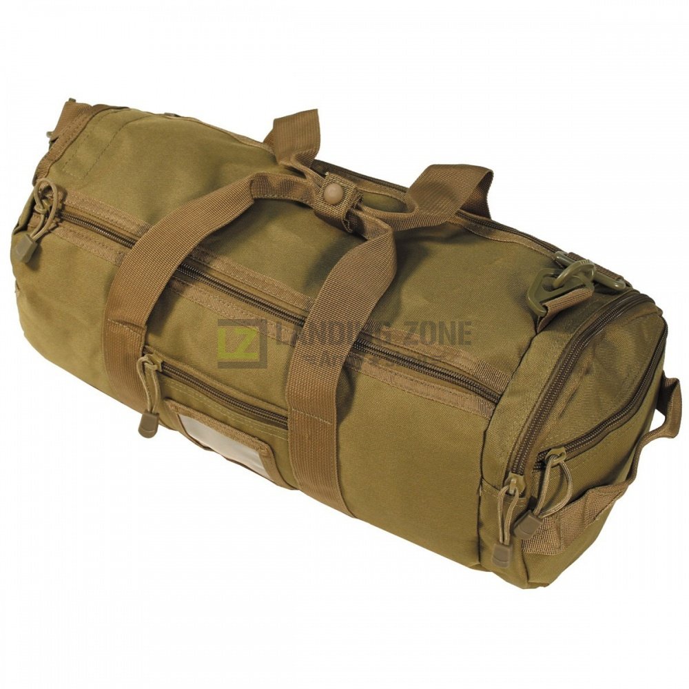 Priročna torba "Operation bag" v tan peščeni barvi. Zapiranje z dvojno zadrgo in velcrom, molle kanali na stranskem in zadnjem delu torbe.