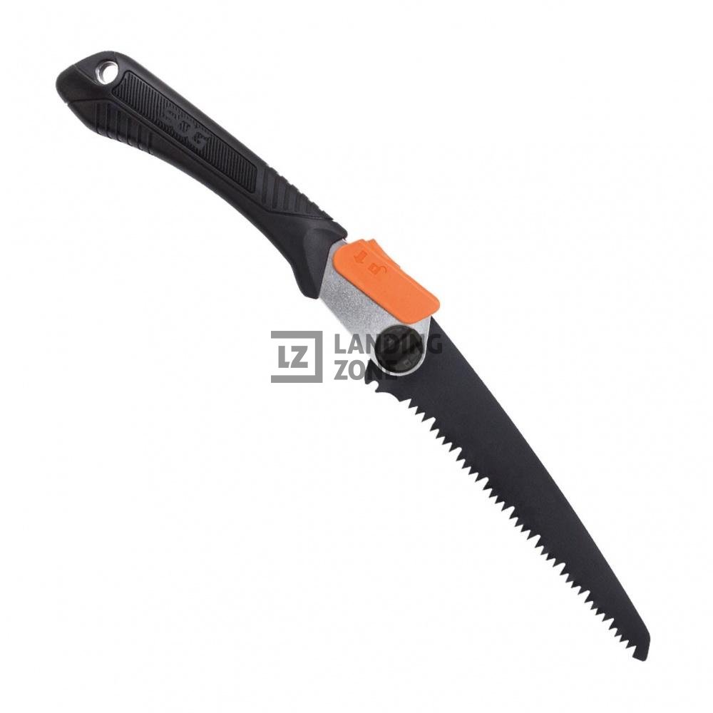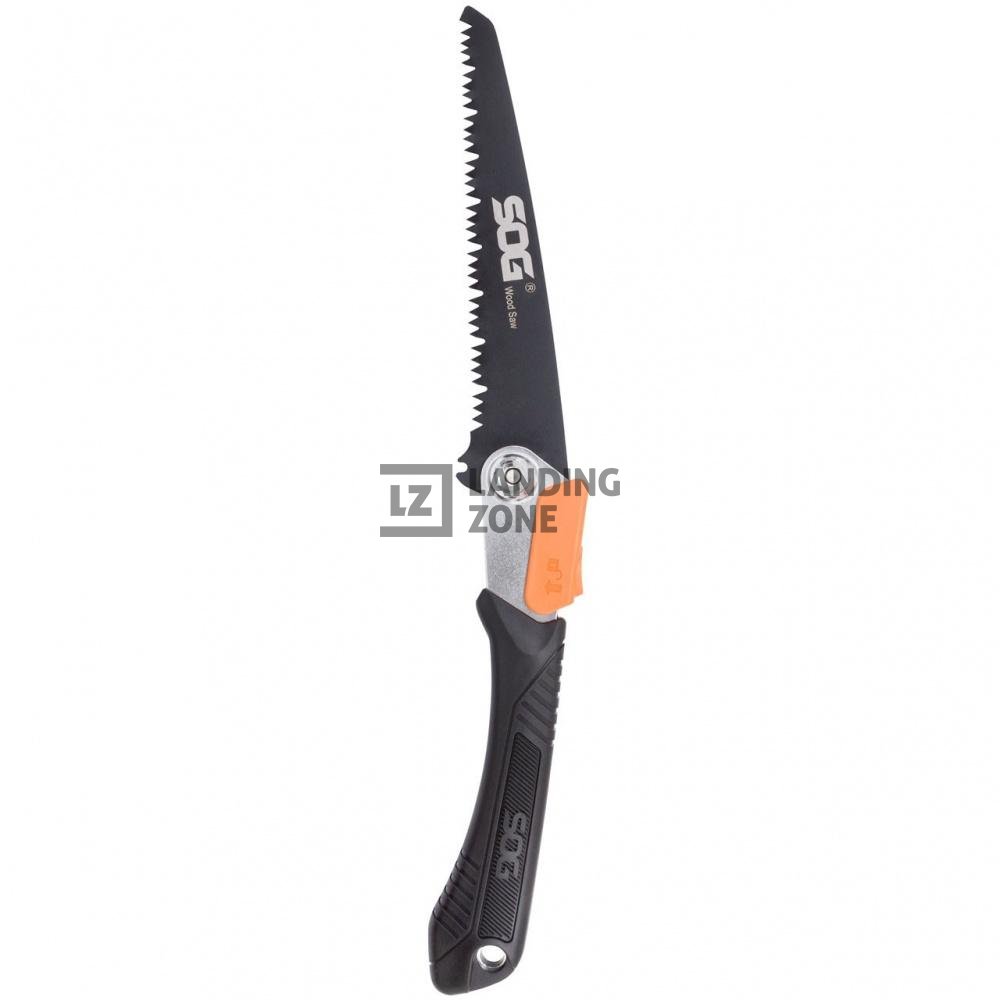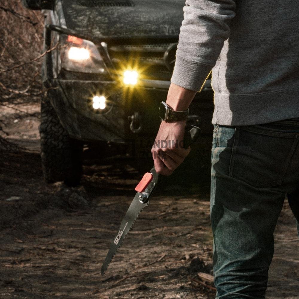 Zložljiva žaga priznanega proizvajalca SOG. Ima trdno in kompaktno konstrukcijo, kljub temu pa ne zavzame veliko prostora v nahrbtniku. Rezilo je izdelano iz kaljenega visokoogljičnega jekla ter zaščiteno s črnim premazom zato je odporno proti koroziji. Zaklepni gumb na žagi omogoča enostavno sprostitev rezila, ki se zaklene v dve poziciji: ravno in upognjeno pod kotom 90°. To omogoča prilagoditev rezila glede na nalogo, ki jo opravljate. Ročaj je prevlečen z gumo in ima jedro iz nerjavečega jekla. Teksturiran gumiran ročaj omogoča zanesljiv oprijem, ergonomska oblika pa preprečuje drsenje roke.