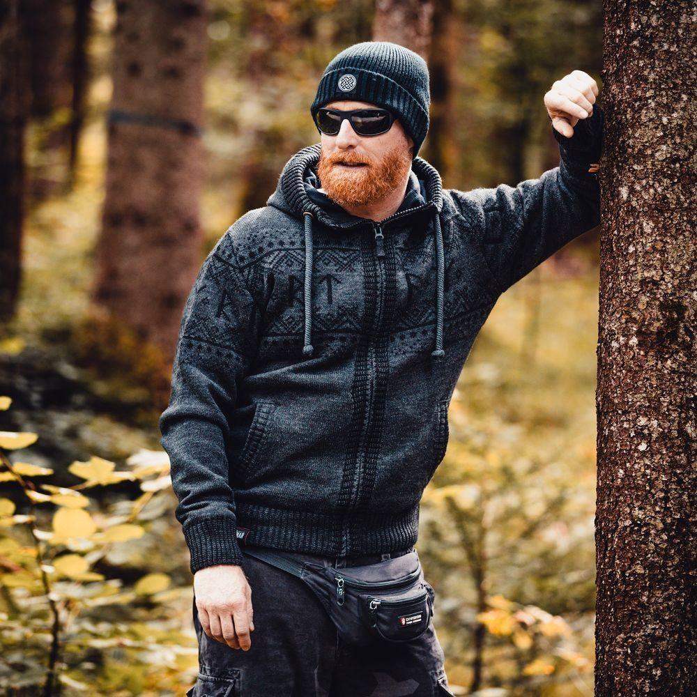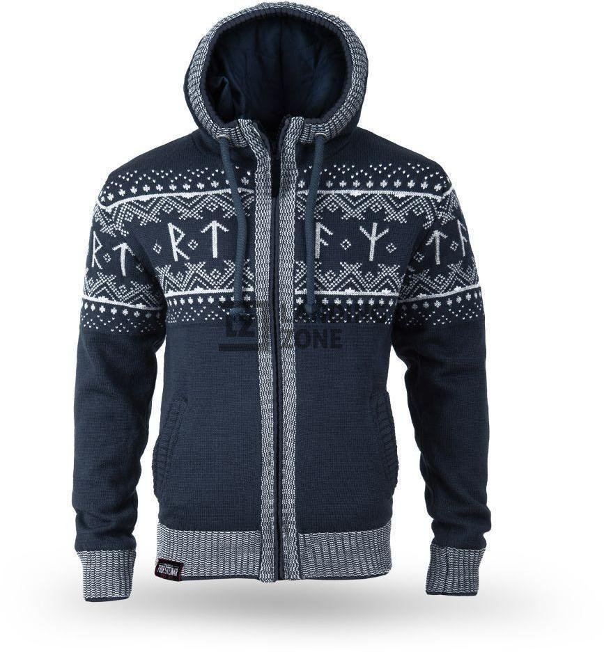 Kakovostna in topla pletena jopa Runa v nordijskem slogu. Jopa ima visoko stoječ ovratnik, kapuca in patenti v pasu ter zapestjih pa zagotavljajo odlično zaščito pred mrazom v jesenskih in zimskih dneh.