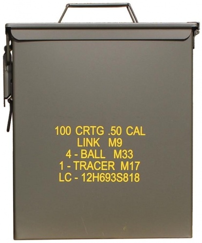 Potiskan kovinski zaboj za strelivo.