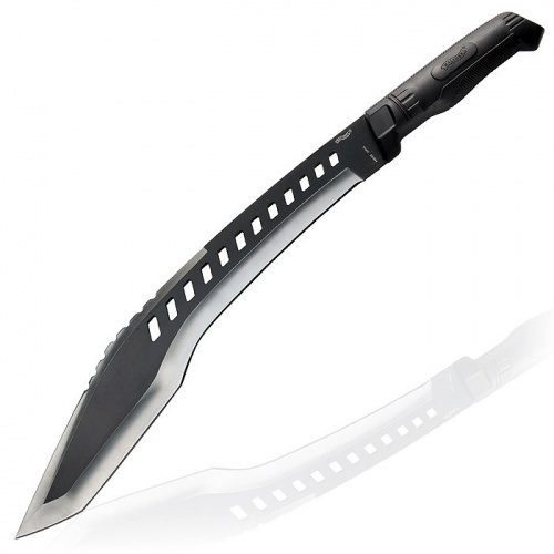 - Izrezane luknje v rezilu ne le dodajo estetski videz, temveč tudi porazdelijo težo na prednji del rezila, kar izboljšuje ravnovesje in uporabnost mačete.